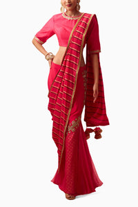 Rani pink foil print organza hand embroidered lehenga adorned with hand embroidered blouse with striped dupatta and handmade latkans.