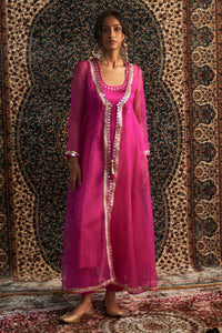 Our long-sleeved, flowy sheer Choga is crafted from lustrous organza, offering an effortlessly luxurious aesthetic. Adorned with intricate gota, mirror, and sequin hand embroidery along the neckline and sleeves, this piece sparkles with artisanal charm. The front is finished with dori tie-ups and elegant tassels, adding a hint of quaint sophistication. Paired with a long slip and sleek narrow pants, this versatile Choga is perfect for layering—whether over a dress, kurta, or pantsuit. A stylish addition to your wardrobe, it effortlessly elevates any look, making it ideal for any occasion, from festive celebrations to elegant evenings out.