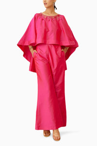 Featuring the Rani Pink Embroidered Co-ord Set by Nikasha from their Kohinoor collection. This striking ensemble includes a rani pink rayon silk mix cape embellished with elegant coin embroidery around the neckline, perfectly paired with matching bell pants for a stylish finish.