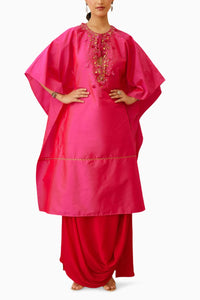 Featuring the Rani Pink Embroidered Skirt Set by Nikasha from their Kohinoor collection. This vibrant ensemble features a rani pink rayon silk mix kaftan adorned with delicate coin embroidery around the neckline, paired with a flowing coral red drape skirt in viscose crepe.