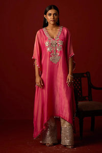 Drape yourself in elegance with this rani pink tissue kaftan, featuring wide sleeves and side slits for graceful movement. Hand-embroidered with mirror work in zari, enhanced with delicate thread and bead detailing, this flowy silhouette is finished with tassel accents and refined inner lining for a luxurious festive appeal.