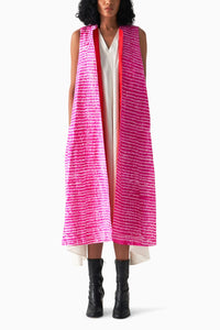 Featuring a versatile and tran-seasonal silk overlay folded & stitched to create narrow pleats featuring fine shibori. This front open layer is lined with contrasting blue silk and minimal loop buttons as a side closure. Easy to dress up or down this is the latest addition to our line up of zero waste silhouttes.