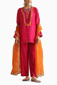 Featuring the Rani Shiro Kurta Set by Shikha Mehta's Soiree Collection. This stunning set includes a thread and hand-embroidered pink silk Chanderi short kurta, paired with silk Chanderi pants and a silk organza dupatta with golden lace accents.