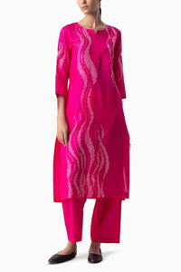Bandhani takes a modern wave like shape on this rani kurta. The design comes interspaced with hand done mirror work. The kurta comes clubbed with organza stole and silk pants.