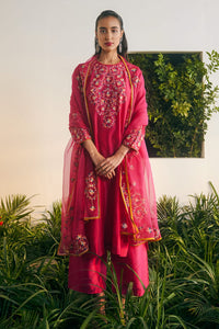 Featuring Rani Zahra Kurta Set by Shikha Mehta from Baagh Collection. This rani pink silk chanderi kurta adorns a relaxed fit and contrasting thread embroidery for a vibrant touch. Paired with silk chanderi wide-leg pants and a silk organza dupatta with matching embroidery, it offers an elegant and cohesive ensemble.