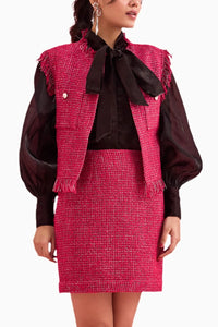 The Raspberry Pink Sleeveless Jacket & Skirt Set offers a stylish and versatile outerwear option, designed with a sleeveless jacket that features fringe detailing for an added touch of flair. Tailored for a sleek fit, this jacket is perfect for layering over shirts, turtlenecks, or dresses, providing warmth and sophistication without restricting movement. Paired with a matching skirt, this set delivers a chic, coordinated look for both professional and evening occasions.
