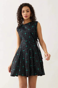 Raven Black Dress in Regal Print—An eye-catching short dress defined by a circular ruched cutout at the waist, accentuated with adjustable string ties on both sides for a personalized fit. The sleeveless design pairs elegantly with a structured round neckline, while subtle seam detailing from the waist creates fluidity and depth. A button closure and concealed zipper at the back ensure a seamless finish.