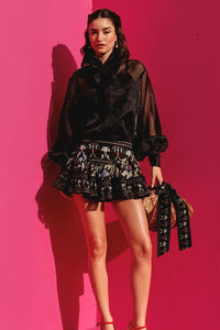 Featuring Raven Co-ord Set by San Seh, this ethereal pairing features a sheer organza shirt styled with a coordinating skirt, creating a fluid and elegant look with modern allure.