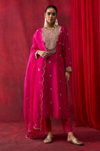 Featuring a pink straight kurta in silk Chanderi, adorned with intricate thread, dori, and hand embroidery. Paired with an embroidered pink silk organza dupatta and complemented by silk Chanderi pants, this ensemble radiates timeless elegance and artisanal charm.