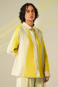 Featuring a tailored mint green shirt with structured shoulders and a relaxed fit, this piece is highlighted by sharp triangular panels in Monet yellow PVC loop embroidery on the front and sleeves. Finished with a classic collar and front button placket for timeless appeal.