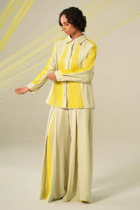 A tailored mint green set that blends sharp structure with bold detailing. The shirt features defined shoulders and relaxed fit, accented by triangular Monet yellow PVC loop embroidery on the front and sleeves. Paired with high-rise wide-leg trousers, finished with pleated front panels and matching embroidery for a cohesive, modern look.
