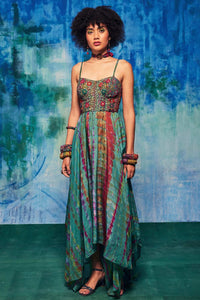 Make a statement with our tie-dye dress, featuring a stunning full upper body aari embroidered corset design. The uneven hem adds a playful twist, while the zip closure at the back ensures a secure fit. Perfect for special occasions or chic outings, this dress beautifully combines bold style with intricate craftsmanship!