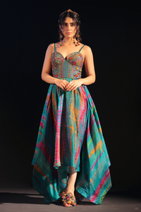 Introducing the Embroidered corset uneven dress in tie dye: a masterpiece of artistry and design. This dress combines the luxurious feel of habutai silk with a contemporary twist in tie dye patterns, creating a captivating visual effect. The corset-style bodice not only accentuates the silhouette but also offers a structured elegance, making it a standout piece for any special occasion. The uneven hemline adds a playful yet sophisticated touch, ensuring movement and flow with every step.