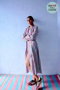 Amer Dress is handcrafted using striped cotton fabric. It features a front button placket, full sleeves, and has a fit & flared silhouette for a comfort fit.