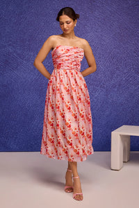 This strapless tube dress in silk organza features our signature Red Aquarelle print. The top is detailed with gathers and ruffles, adding a sense of playfulness. Below, delicate pleats lend fluidity and elegance, making this silhouette both striking and easy to wear for day or night.