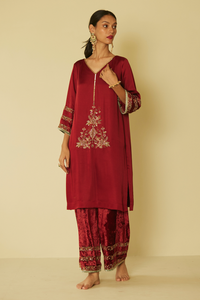 Featuring Red Arya Kurta Set by Sarang Kaur by Meera Collection. This exquisite ensemble showcases a satin silk kurta paired with velvet pants in a bold red hue. Ideal for festive occasions, it blends luxurious comfort with timeless elegance, making a statement of refined style.