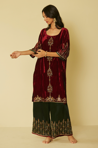 Featuring Red Bageecha Kurta Set by Sarang Kaur by Meera Collection. This stunning ensemble features a velvet kurta paired with mushroom silk pants in bold red. Perfect for special occasions, it combines luxurious comfort
