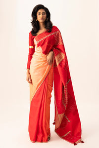 Featuring Bandhani Patchwork Saree on Silk that has a unique palla made by using organic shapes of Bandhani patches put together using the quilting method. Hand embroidered gota patti borders interspaces these patches making the look festive. The saree comes with a Bandhani on Silk blouse piece in red.