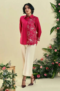 Designed in a relaxed, comfortable fit, this vibrant red co-ord set features delicate floral embroidery with intricate cutwork on one panel and sleeve cuffs. A box pleat at the back adds subtle structure, while the straight-fit pants offer ease and elegance for everyday wear.