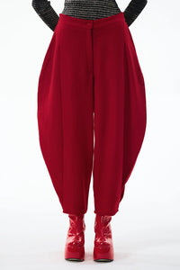 Sculpted trousers, with a take on balloon silhoutte with bold pleats. Made in handwoven woollen felt, the silhouette holds a good structure while giving good flow to the form.