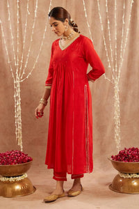 Fabric- Kurta- Chanderi, Pant- Chanderi Color- Red Fit- Regular Components- 2 Product Code- SVENEROGMLKS29