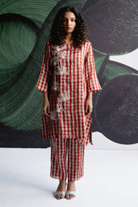 Featuring a red check A-line kurta set, this ensemble is beautifully detailed with feminine floral embroidery and delicate pearl accents. A graceful blend of traditional charm and modern elegance, it's perfect for festive gatherings, celebrations, or daytime events.