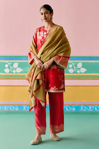 A striking harmony of tradition and elegance, the Red Chintz Kurta Set is crafted in fine Chanderi with hand-embroidered beading on the neckline and lace accents on the sleeves and hem. Paired with straight pants and a lace-edged tissue dupatta with tassels, it’s perfect for festive celebrations.