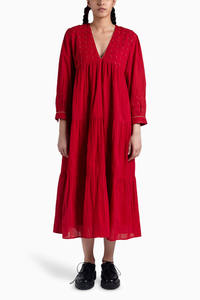 Clair, a red voile dress featuring V-neckline and tonal check pattern.