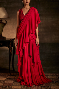Featuring Red drape saree on georgette fabric with frills, the blouse is attached to the saree and is emellished with sequins moti and swarovski.