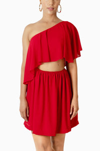 Featuring Red Dune Dress by Kiran Gupta Label. A playful one-shoulder ruffle skater dress with cutout detailing brings in just the right oomph to this cute look.