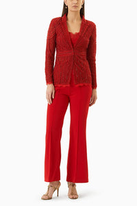 Redefine tailored dressing with Red Embellished Jacket with camisole and pants. Made with a buttery soft, red lace fabric. It comes with an impeccably tailored crystal jacket with structured shoulders. Paired with red pants-made to fit perfectly and a matching cami to complete the look!