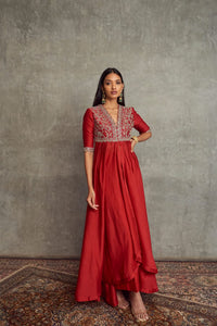 Featuring a red high low Anarkali in chanderi silk base with zardozi embroidery. It is paired with matching palazzo pants. The set is crafted with the finest materials and will accentuate the look.
