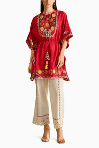 Featuring red chanderi chainstitch threadwork and beadwork yoke detail kaftan paired with ivory chanderi threadwork and cutwork pants .