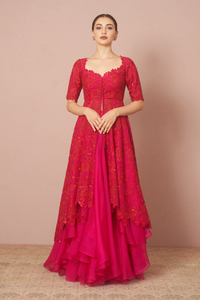 Featuring a red on pink thread embroidered cutdana highlight aditi rao jacket set in organza base. The set is crafted with the finest materials and will accentuate the look.
