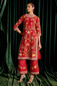 Introducing our vibrant red Chanderi kurta, beautifully adorned with multicolor floral chain-stitch threadwork, beadwork, and cordwork. This stunning piece is complemented by matching pants, creating a cohesive and eye-catching ensemble. Perfect for festive occasions, this outfit blends traditional craftsmanship with modern flair.