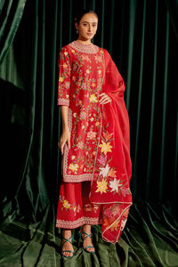 Introducing our vibrant red Chanderi kurta, beautifully adorned with multicolor floral chain-stitch threadwork, beadwork, and cordwork. This stunning piece is complemented by matching pants, creating a cohesive and eye-catching ensemble. To complete the look, a matching silk organza dupatta adds an extra layer of sophistication. Ideal for festive occasions, this outfit beautifully combines tradition and modern elegance, making it a show-stopping choice!