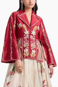Featuring a red chanderi contrast cord and beadwork 3D floral Appliqué  paneled jacket Chandrima's Florens collection. The paneled design offers a flattering fit, accentuating your silhouette while providing comfort.