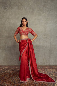 Featuring a red saree in silk base with zardozi embroidery with an embroidered blouse. The set is crafted with the finest materials and will accentuate the look.