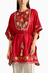Featuring red chanderi chainstitch threadwork and beadwork yoke detail kaftan.