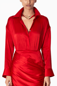 Our essential satin shirt is a perfect Blend of casual and Glam . Made for a relaxed fit and is detailed with a wide cuff and concealed placket . Button it down or leave it open for a cool overlay shirt look. Pair it with our soho skirt for a glam look.