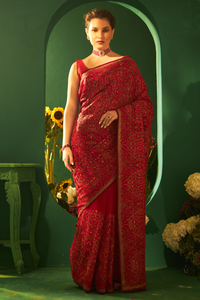 Featuring red saree in georgette with Kashmiri needle thread embroidery. The set is crafted with the finest materials and will accentuate the look.