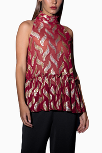 Featuring Red Halter Neck Top With Frilled Hem by Swatee Singh. Revel in sophistication with maroon Georgette. This relaxed-fit top, featuring a halter neck and frilled hem, is a stylish expression of modern glamour.
