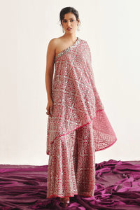 Introducing the Red Hexagon One Shoulder Cape from the Rangrez collection by 29 India. Designed in a striking Red hue, this statement piece features exquisite Mirrorwork and Beadwork embroidery, beautifully crafted on luxurious Tulle fabric. With its unique hexagonal silhouette and one-shoulder design, this tailored cape exudes elegance and modern sophistication.