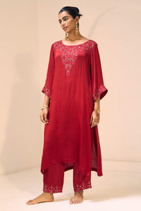Featuring Red Isha Kurta Set by Sarang Kaur from Seerat Collection. This ensemble includes a vibrant red satin georgette kurta and satin silk pants, both adorned with intricate embroidery. This elegant set offers a stunning combination of luxurious fabrics and detailed craftsmanship.
