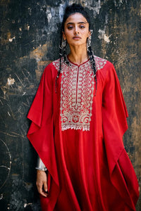 This luxurious red embroidered Kaftan is crafted from silk and features intricate Zardozi detailing. The elegant design combines traditional embroidery with modern sophistication, making it a perfect choice for any festive or special occasion.