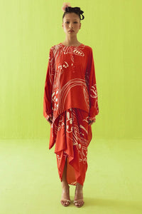This vibrant red ensemble features an oversized kaftan-style top with bold white nature-inspired prints, paired with a matching draped skirt. The fluid silhouette blends expressive design with relaxed elegance.