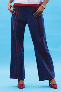 Denim blue jeans with bold red stripes running down in the front, adding a pop of color and a sporty touch to the classic denim look. The red stripes create a dynamic contrast, making these jeans both stylish and eye-catching for a modern, casual outfit.