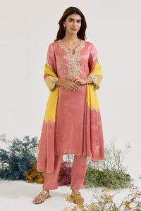Fabric- Kurta and Pants- Tissue, Dupatta- Chanderi Stripe, Tissue Color- Kurta and Pants- Red, Dupatta- Mustard Embroidery- Kurta and Pants- Machine Embroidery , Dupatta- Machine Embroidery Fit- Relaxed Fit Size Worn by Model- S Model Height- 5'5 Components- 3 Product Code- SVENEROSTKS03&STD03