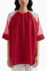 Discover the elegance of our front-open, button-up free-size shibori red shirt, designed to make a sophisticated statement. This versatile shirt features a striking shibori pattern in a deep black hue, with delicate zari embellishments along the placket and detailing, adding a touch of intricate shimmer. The free-size cut ensures a comfortable and flattering fit for various body types, while the button-up design offers a classic and polished look. Ideal for both formal occasions and stylish everyday wear, this shirt seamlessly blends traditional artistry with contemporary flair.