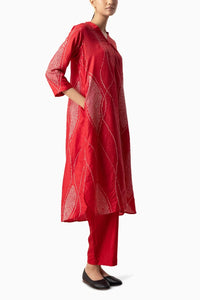 This red pure silk co-ord set comes with intricate meandering Bandhani maze like pattern on the kurta. The neck is a modern V shape, and the back has a central pleat detail. It comes clubbed with a pure silk pants in the same colour.
